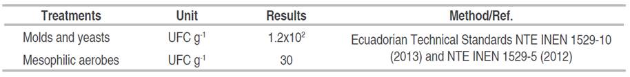 Mold and yeast analyses were performed on the treatment that presented the best sensory characteristics. These were carried out in certified laboratories using the methods described in the Ecuadorian Technical Standard NTE INEN 1529-10 (INEN 2013).