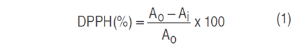 Where Ao and Ai are the absorbance of the DPPH solution and the sample-DPPH mixture, respectively. The DPPH radical scavenging effect was determined by IC50 value in comparison with the control ascorbic acid.