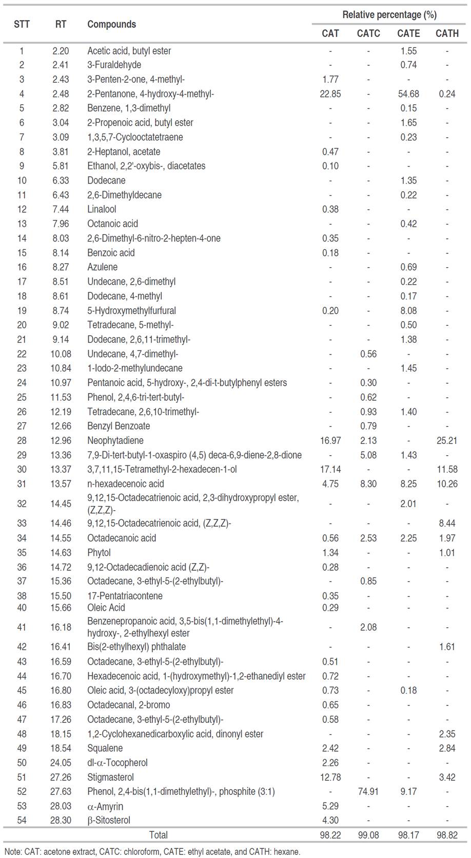 The chemical components of the acetone extract and chloroform, ethyl acetate, and hexane fractions of C. cattienensis are shown in Table 1 and Figure 1. A total of 54 compounds were found in the four extracts studied. The acetone extract was found to be rich in 2-pentanone, 4-hydroxy-4-methyl (22.85%); 3,7,11,15-tetramethyl-2-hexadecen-1-ol (17.14%); neophytadiene (16.97%); stigmasterol (12.78%); α-amyrin (5.29%); and n-hexadecanoic acid (4.75%). The chloroform fraction possessed phenol, 2,4-bis(1,1-dimethylethyl)-, phosphite (3:1) (74.91%); n-hexadecanoic acid (8.30%); and 7,9-di-tert-butyl-1-oxaspiro (4,5) deca-6,9-diene-2,8-dione (5.08%) as the major compounds. The ethyl acetate fraction was mainly composed of 2-pentanone, 4-hydroxy-4-methyl (54.68%); phenol, 2,4-bis(1,1-dimethylethyl)-, phosphite (3:1) (9.17%); n-hexadecanoic acid (8.25%); and 5-hydroxymethylfurfural (8.08%) whereas hexanedioic acid, bis(2-ethylhexyl) ester (30.89%); neophytadiene (25.21%); 3,7,11,15-tetramethyl-2-hexadecen-1-ol (11.58%); n-hexadecanoic acid (10.26%); and 9,12,15-octadecatrienoic acid, (Z,Z,Z)- (8.44%) were the major compounds in the n-hexane fraction.
