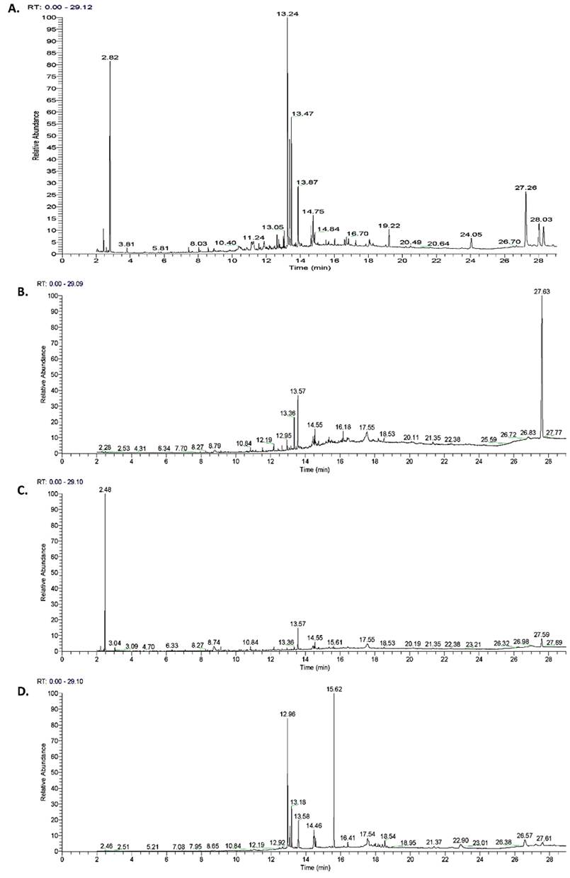Figure 1: The GC chromatogram of A. acetone extract from Camellia cattienensis and B. chloroform, C. ethyl acetate, and D. hexane fractions from Camellia cattienensis.