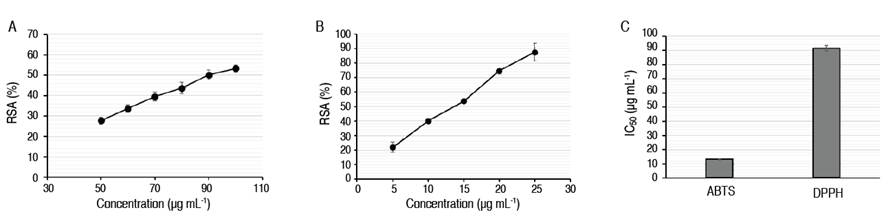 The antioxidant effects of the tested extract from C. cattienensis were shown in Figure 2. Accordingly, the extract had the DPPH, ABTS free radical scavenging with the IC50 values of 91.63±1.88 and 13.32±0.49 µg mL-1, respectively.