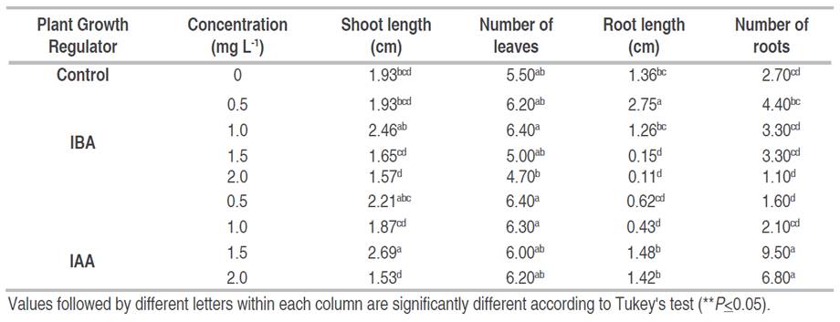 For root length and root number, 1.5 mg L-1 (IAA) yielded the most favorable results, with mean values of 1.48 and 9.50 cm, respectively. Conversely, 2.0 mg L-1 (IBA) was the least effective, resulting in a mean root length of 0.11 cm and only 1.10 cm on average. Detailed data for all treatments are provided in Table 1.