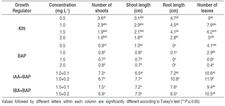 After 45 days of cultivation, explants were evaluated based on the effects of different treatments. Combinations of auxins and cytokinins (IAA+BAP and IBA+BAP) produced significant variations in explant height. The treatment with 1.0 + 0.2 mg L-1 (IAA+BAP) yielded the best results in terms of height, with an average of 7.7 cm, ranging from 3.7 to 11.5 cm. This treatment was significantly superior compared to others, such as those containing only KIN or BAP, which resulted in lower average shoot lengths (Table 2).