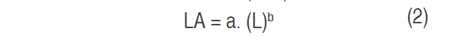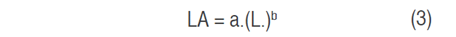 In Equation 1, the angular coefficient (a) was estimated by linear regression, forcing the line to pass through the origin (b=1), which is more advisable, because when the measured area is equal to zero, the calculated area will also be zero. In Equations 2 and 3, the angular coefficient (a) was estimated by non-linear regression; the line tends to pass by the origin, where the coefficient is considered as null.