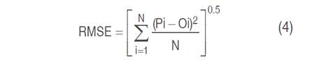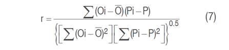 Where the equations 4, 5, 6, 7, Pi is the estimated LA values (cm2 per leaf), P is the mean of the estimated LA values (cm2 per leaf), Oi is the observed LA values (cm2 per leaf), Ō is the observed mean LA values (cm2 per leaf) and N is the number of observations.