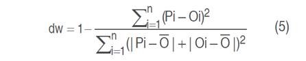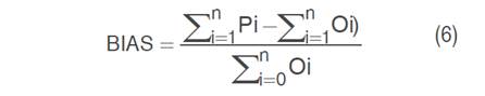 To evaluate the performance of the Equations, the following statistical indices were used: Root mean square error (RMSE) (Equation 4), index of agreement (dw) (Equation 5), BIAS index (Equation 6), correlation coefficient (r) (Equation 7), index of confidence or performance (c) (Equation 8), as follows.