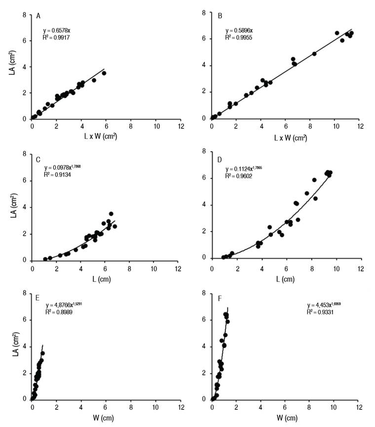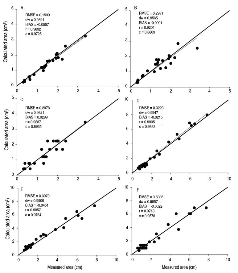 This can be inferred because the points are close to the hypothetical 1:1 line, indicating that the measured area is close to the calculated area, and the angular coefficients of determination (R2) are closer to 1 (Figures 2A, D). It should be noted that there were small dispersions of the data in relation to the lines, which suggests that the specific equations may satisfactorily represent the actual LA.