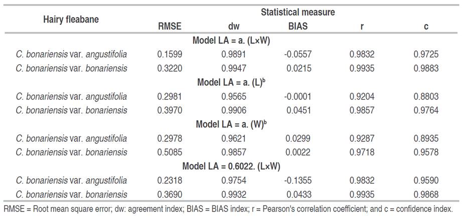 A comparison between the statistics (RMSE, dw, BIAS, rand c) of performance of the specific variety equations (LA Model = a. (L×W)) and the same statistics but using the general equation (LA Model = 0.6022. (L×W)) showed that, for Conyza bonariensis var. angustifolia and Conyza bonariensis var. bonariensis, the best performance was found when the specific variety equations were used (Table 1). More accurate estimates of the LA were found for Ipomoea hederifolia and Ipomoea nill using specific Equations (Bianco et al. 2007).