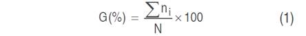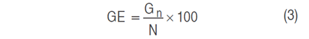 Where G1, G2, ... Gn refer to the number of germinated seeds and N1, N2, ... Nn, to the number of days after in vitro inoculation. Germination energy (GE) was determined using Equation 3: