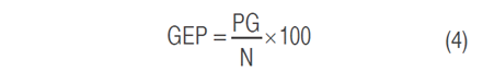 Where Gn is the number of seeds germinated in a given day period (seven days), and N is the total number of inoculated seeds. The germination energy period (GEP) was used through Equation 4: