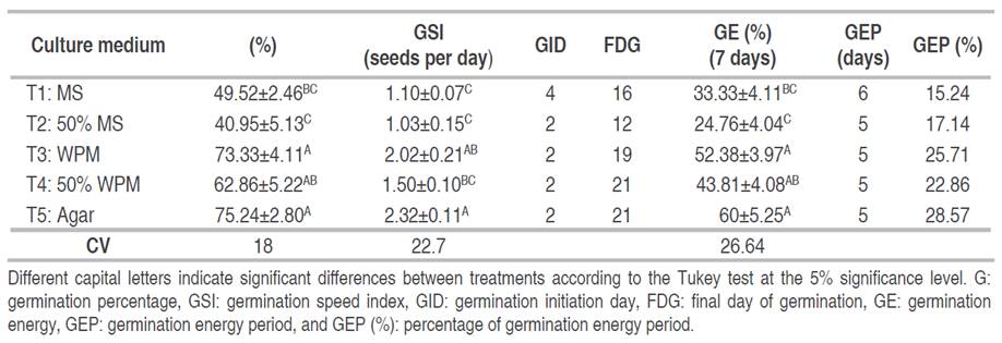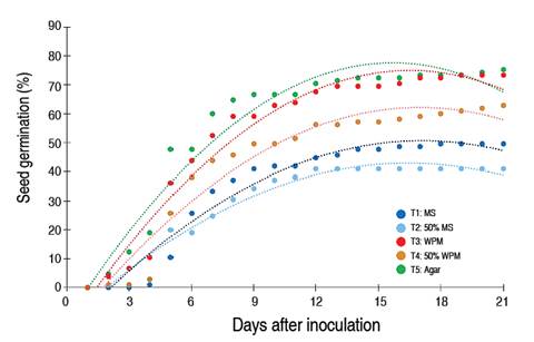 For in vitro germination, Murashige and Skoog (MS) and Woody Plant Medium (WPM) at different concentrations were used as base culture medium. Agar alone was used as a control. The experiment consisted of five treatments: T1: 100% MS, T2: 50% MS, T3: 100% WPM, T4: 50% WPM, and T5: control (agar only). Additionally, in each of the treatments, 6.5 g L-1 of agar (PhytoTech®), 30 g L-1 of sucrose, and pH was adjusted to 5.8. However, for the control (T5), only 30 g L-1 sucrose was added, and the pH was adjusted to 5.8, because it already contained agar.