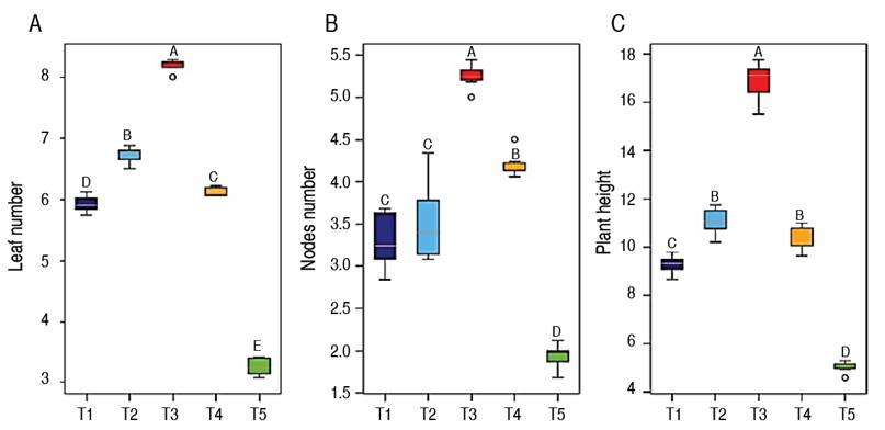 Figure 2: Effect of culture media on in vitro morphological development of C. spruceanum. A. number of leaves (LN). B. number of nodes (NN), and C. plant height (PH). T1: MS; T2: 50% MS; T3: WPM; T4: 50% WPM; and T5: Agar. Different letters indicate significant differences between treatments according to Tukey's test at 5% significance level.