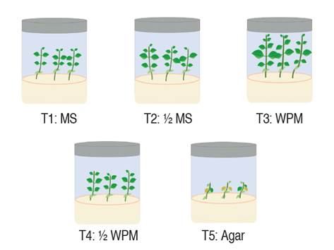After 70 days of in vitro cultivation of C. spruceanum, T3 (WPM) exhibited the highest mean number of leaves (8.18 leaves per plant) and the greatest leaf area. These characteristics are associated with increased survival during the post-in vitro acclimatization phase and contribute to more efficient seedling production in a shorter period (Valladares and Niinemets 2008). In contrast, plants under treatment T5 (agar) displayed yellowish leaves with visible signs of stress, likely due to the absence of nutrients in the culture medium (Figure 3). These observations highlight the need for further studies on nutrient accumulation in plant tissues to complement the present findings. Similar results were reported by Gonzales-Alvarado et al. (2022) in Guazuma crinita, where plants cultured in phytogel for four months exhibited leaf yellowing and other stress-related symptoms.
