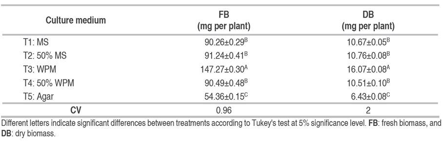 Similar results were reported by Marwein et al. (2024), Lima et al. (2024), and Meneses et al. (2022), in which WPM demonstrated superior efficiency compared to other culture media, promoting the morphological development of in vitro seedlings of Rhododendron inaequale Hutch, Vismia japurensis, and Vaccinium floribundum, respectively. According to Krasnoperova and Bukharina (2020), indicated that WPM enhances both plant survival and development, supporting the hypothesis that this medium optimizes the morphological development of Calycophyllum spruceanum. To date, no previous studies have evaluated this specific aspect, suggesting that the present findings may contribute to the large-scale propagation of the species with improved morphological traits, suitable for meeting market demand in ecological restoration programs and industrial applications.