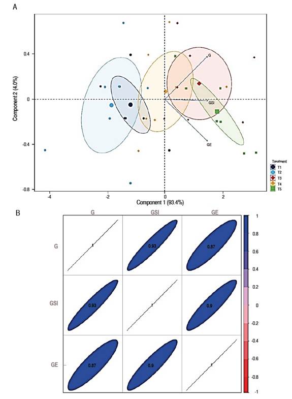 Figure 4: A: Main component analysis of germination parameters of C. spruceanum, and B: Correlation analysis between germination variables of C. spruceanum. G: germination percentage, GSI: germination speed index, and GE: germination energy.