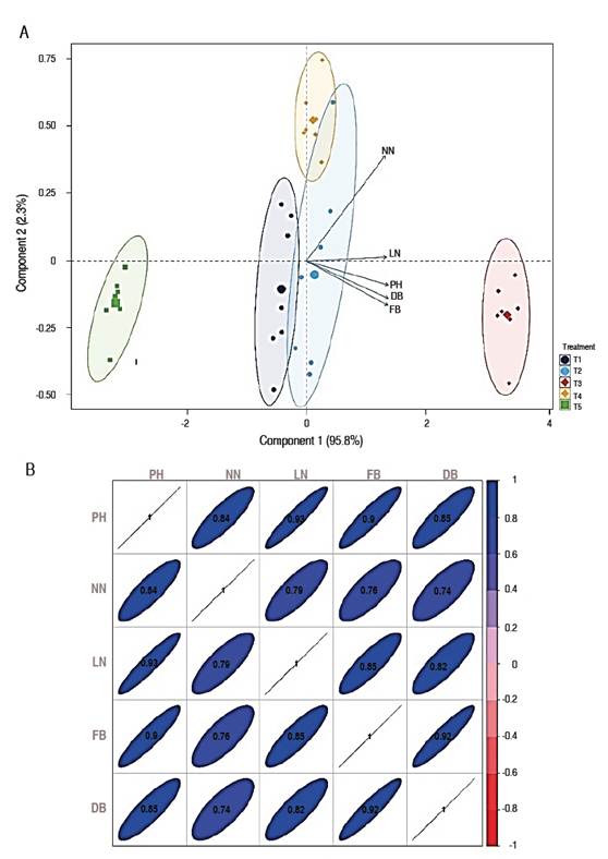Regarding morphological development, the correlations of plant height (PH), number of nodes (NN), and number of leaves (LN) were greater than 0.84, suggesting a strong association between these growth factors. The highest correlations were recorded between fresh biomass (FB) and dry biomass (DB), with a value of 0.92, confirming that better morphological development contributes directly to higher biomass accumulation. Similar results were reported by Gonzales-Alvarado et al. (2024) and Mori-Vásquez et al. (2024) in Guazuma crinita and Simarouba amara, respectively, where strong correlations were evidenced between fresh and dry biomass, as well as between plant height and biomass. These results reinforce the present findings and confirm the interdependence between morphological traits and biomass production.