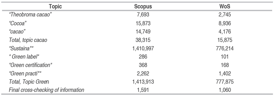 Keywords and similar terms were explored in topics delimited by the research, classifying the level of importance according to the number of records. The first one was called Cocoa, a topic that covers the terminology on this crop, in which the term with the highest result was "cocoa" with 15,873 records in Scopus, and 8,936 in WoS, for a total of 38,315 and 15,875 in the respective databases. Secondly, the dimension of green practices was explored, where the term sustainability is the most used by the scientific community, with 1,410,997 and 776,214. This group is the most influential in the research, with a total result of 1,413,913 and 777,875, which integrates all the terminology associated with this group. Finally, in the integration using the selection mechanisms represented in the Boolean operators for the design of a search strategy to capture data with the topics related to the research ("Green label") OR ("green certification") OR ("Sustaina*") OR ("green practi*") AND ("Theobroma cacao") OR ("Cocoa") OR ("Cacao"). On July 10, 2025, 1,591 and 1,060 documents were identified documents related to cocoa integrating green practices. This exploration was performed on the main structure of the documents (title, abstract, and keywords). Table 1 presents the results of the two databases.