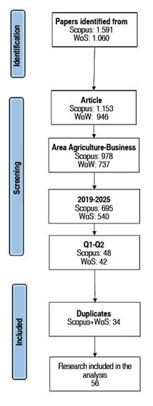 The PRISMA method was used as input for the research approach to provide a clear and concise systematic approach to data mining (Agyei et al. 2024). The following classification parameters were used to classify information search focused only on articles in areas related to research, such as agriculture and business, in Scopus. The following subject areas were selected: Agricultural and Biological Sciences, Environmental, Social Sciences, Economics, Econometrics, and Finance. Also, in WoS, the selected research areas were Environmental Sciences, Ecology, Agriculture, and Science Technology. Other topics were Food Science Technology, Forestry, Business Economics, and Biodiversity Conservation, to identify global scientific trends. The search was limited to the production of the last six years only (2019-2025). For greater quality in the processing of the information, only articles belonging to quartiles one and two (Q1 and Q2) were selected for a final result in the two databases of 48 and 42 (Figure 1). Finally, to end duplicates, processes were conducted to verify the information, in the R open-source software, R Studio version 4.3.2, in BibTex format, in the two databases. The result was 34 duplicate documents eliminated for a net resulting of the unification of 56. This research did not include articles classified in quartiles 3 and 4 (Q3-Q4), and databases other than Scopus and WoS were not used, which may introduce limitations in the results.