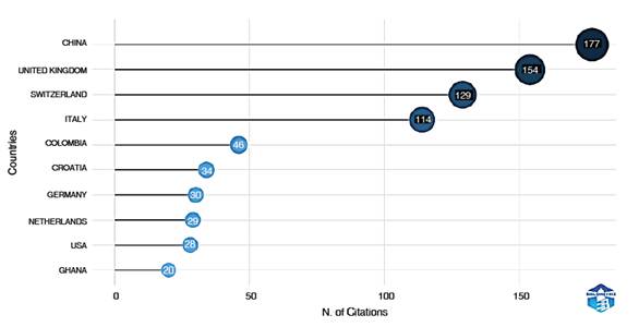 Figure 4 analyzes citations by country; the top 5, according to total citations, is led by China (177), the United Kingdom (154), Switzerland (129), and Italy (144). It is worth noting the representation of Colombia in this ranking: (46).
