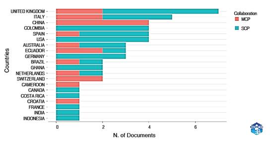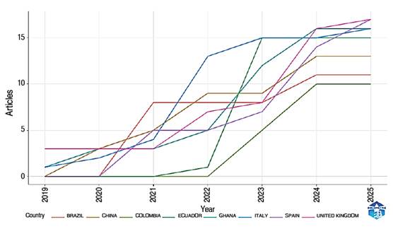 Figure 5 presents the ranking according to Multiple Country Publications (MCP) and Single Country Publications (SCP). According to the combination of these variables, the UK leads, followed by Italy and China. In the case of Colombia, research has been carried out only in this country. Figure 6 shows the historical production by country over the last 5 years, which was initiated by Ghana, the UK, and Italy. Among the new scientific actors, Colombia appears with recent publications in the year 2023 (5) and 2024-2025(10), respectively (Figure 6).
