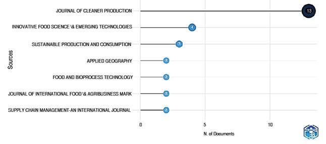 Figure 7 shows the top 5 sources according to the number of published articles. Important classifications are highlighted according to the number of records: Journal of Cleaner Production (13); Innovative Food Science (4); Sustainable Production and Consumption (3). Finally, there are the Applied Geography, Food and Bioprocess Technology, the Journal of International Food and Agribusiness Marketing, and the Supply Chain Management: An International Journal with two registrations, respectively.