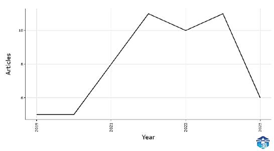 Figure 8 presents the historical distribution of publications, starting in 2019 with 5 papers, reaching historical highs in 2022 with 11 papers, in 2023 there was a 9% decrease in the number of queries. In 2024, there were the same number of papers as in 2022. In the first half of 2025, the figure is 5 research.