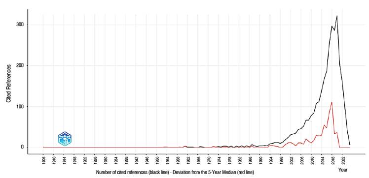 The analysis of references by spectroscopy shows the evolution of citations over time, showing their importance in scientific research (Nica et al. 2024). According to Figure 9, the first reference found was the research of Nevinson (1906), with one citation. The historical maximum occurred in the 2020s, with 322, taking Adesanya et al. (2020) and LeBaron et al. (2020) as a ranking. According to Google, academic citations for these papers were 120 and 101, respectively (Figure 9).