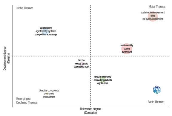 The following parameters were used to configure the analysis: Number of words: 70, Minimum frequency of clusters (per thousand documents): 5, Number of labels: 3, Label size: 0.3, Community repulsion, and Clustering algorithm Walktrap. The research agenda can be approached from four quadrants: 1) Basic: issues with work that relates to circular economy, cocoa byproducts and agritourism; 2) Emerging themes: bioactive compounds, polyphenols pretreatment, biochar, cocoa beans, cocoa pod husk; 3) Niche topics are studies related to adoption, agroforestry, agroforestry systems and competitive advantages and 4) Motor topics: sustainability, cocoa, agriculture, life cycle assessment, food and sustainable development.