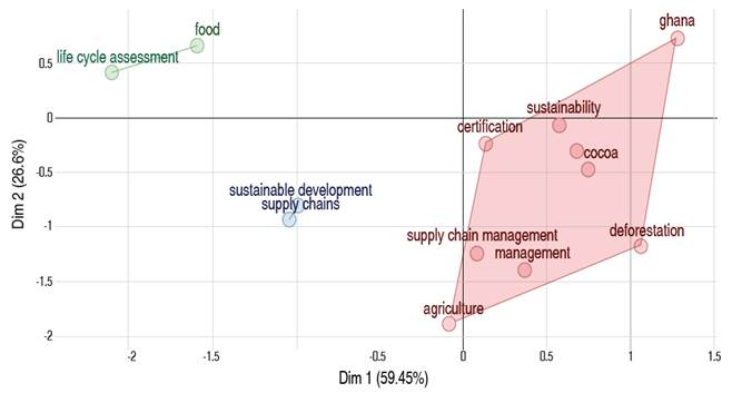 The factorial reduction technique is applied to reduce dimensions and group similarities in scientific topics (Talero-Sarmiento et al. 2025). In this context, by using the multiple correspondence analysis technique (MCA), which represents the data as a point in a low-dimensional Euclidean space (Abafe et al. 2022). The K-means method was applied to study the association of the co-citation matrix with K=3; the variance of the information in the two dimensions was 86.05%. The first research trend in the green group is related to life cycle assessment in food. The second blue trend focuses on the sustainable development of supply chains. Finally, the third red trend is related to cocoa, certifications, sustainability, and supply chain management (Figure 11).