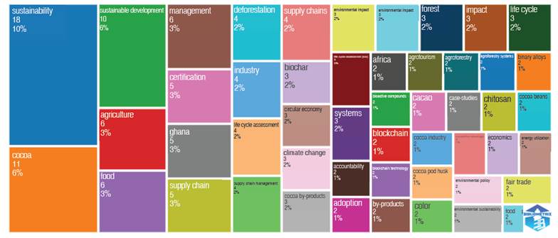 Sustainability (18), Cocoa (11), sustainable development (10), life cycle assessment (7), agriculture, environmental impact, food and management (6), respectively. Figure 13 shows the rectangle diagram, where the size of the geometrical figure represents the importance of the Word (Purna Prakash et al. 2024) and their percentage of use frequency. The following stand out in the same classification, with 40% of the total number of records: Sustainability (10), Cocoa, sustainable development, life cycle assessment, agriculture, environmental impact and food and management (6), respectively (Figure 13).