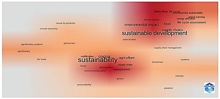 The co-occurrence analysis studies the relationship between keywords. The size of the node and closeness between words allow it to determine the degree of association between them (Det Udomsap and Hallinger 2020). The Walktrap algorithm is recognized for its efficiency in the clustering of key terms and the design of the visualization of the mapping of fields (Pons and Latapy 2005). According to Figure 14, three important word clusters were identified. The first red cluster focused more on sustainability and was related to agro-tourism, agro-forestry, forestry, and certifications, especially fair trade, the cocoa industry, and emerging technologies such as the blockchain. The second, the green color, is more focused on sustainable development related to climate change, global warming, supply chain, life cycle assessment, and environmental impacts. Finally, the purple cluster focuses more on the circular economy and cocoa byproducts. In order to identify the research trends, a density map was used, where the intensity of red color represents the most important scientific currents. According to the above, in the cluster focused on sustainability, most of the research is done in environmental policies, deforestation, and management, and the cluster led by sustainable development, environmental impacts, climate change, and life cycle assessment (Figure 15) (Sun et al. 2023).