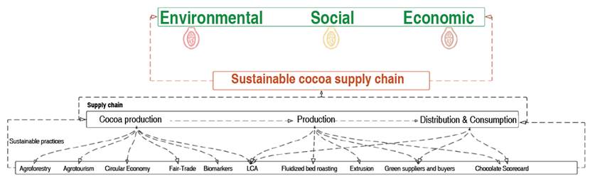 According to the literature, the recent increase in global temperatures, surpassing levels recorded in the 19th century, is expected to cause more frequent droughts, food shortages, and a decline in the nutritional quality of food. By defining sustainable cocoa production as an environmentally friendly agricultural process that generates economic gains and benefits families, the above corresponds to only one link in the sustainable supply chain, which covers production, manufacturing, and marketing, in which balance must be maintained in the three pillars (Environmental, Economic, and Social) for sustainable supply chain holders.