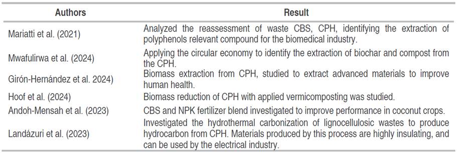 Table 3 presents six authors who investigated the reassessment of cocoa byproducts: Cocoa bean shells (CBS) and pod husks (CPH), from which biochar, polyphenols, advanced materials, improved fertilizers, compost, and hydrocarbons can be obtained.