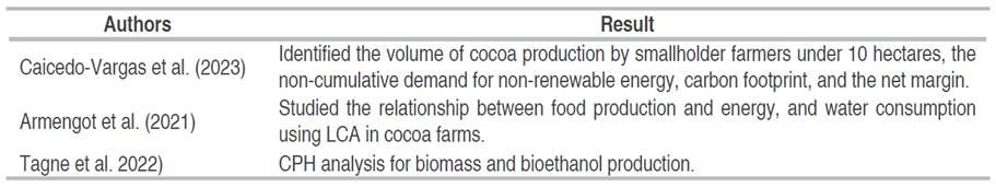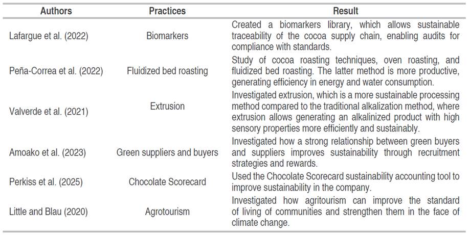 Rathgens et al. (2020) presented the problem of child labor in the cocoa sector, which is a deepening in the assessment of the impact of the certifications, the main challenge for academics. Mariatti et al. (2021) identified the processes successfully implemented in the management of cocoa husk and corncob residues, in addition to the contribution of technologies associated with Industry 4.0 as an input to circular economy practices, so that this constructive collaboration between technologies and practice strengthens economic and environmental performance.