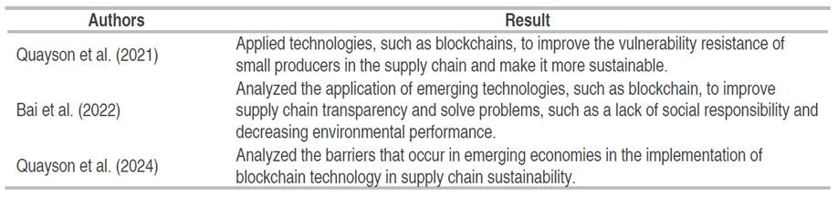 Table 5 presents two authors' research on the Sustainable supply chain, which relies on the blockchain to map the supply chain, guaranteeing its sustainability and transparency.