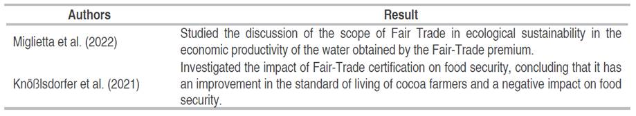 Ribeiro-Duthie et al. (2021) found the relevant literature on fair trade certification of staple foods, including cocoa. The importance of this certification is that it informs the consumer about the fairness of producers' wages and the democratization of production and sustainability. Perez et al. (2022) identified the main challenges related to the sustainability of the chocolate industry, such as the complexity of monitoring the cocoa and chocolate supply chain, the limited training of farmers in good environmental practices, the slow adaptation to the certification process required by European markets for the export of the product from 2020, and the environmental costs associated with packaging.