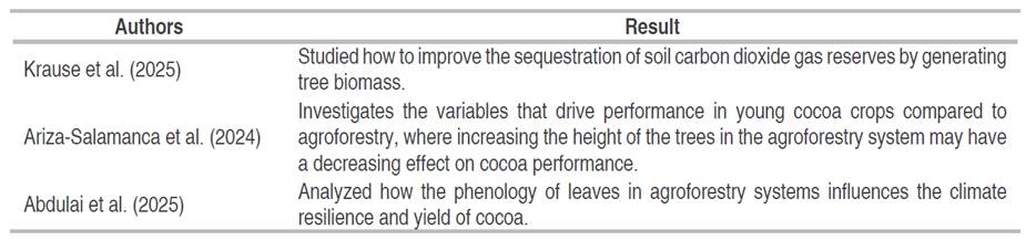 Agroforestry emerges as a sustainable system that allows generating benefits to cocoa cultivation, such as planting shade trees to improve production performance and pest control, also minimizing environmental impacts by eliminating the use of chemical insecticides. Also, biomass produced by trees increases the stock of carbon and nutrients in the soil, which improves production yields, which can be transformed into income in carbon payment systems (Krause et al. 2025). However, these agroforestry systems compete with the resources of cocoa monocrops, with the analysis of the compensation system between the consumption of water, space, and light of the trees versus the performance in cocoa production being important (Abdulai et al. 2025; Ariza-Salamanca et al. 2024).