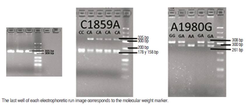 Digestion with BstXI enzymes (for C1859A polymorphism) and BclI (for A1980G polymorphism) was performed in a final volume of 10 µL, including 3 µL of the PCR product, 5 units of restriction enzyme, 1 µL of the corresponding buffer and ultrapure water. Reactions were incubated at 37 °C for 16 hours and visualized on 3% agarose gels stained with EZ-Vision. The bands obtained by digestion with BstXI were of 335 bp for AA genotype, 335 bp/178 bp/158 bp for CA genotype and 178 bp/157 bp for CC genotype. The bands obtained by digestion with BclI are 308 bp/27 bp for GG genotype, 308 bp/261 bp/47 bp/27 bp for GA genotype and 261 bp/47 bp/27 bp for AA genotype. Bands of 47 and 27 bp are not displayed on the gel due to its size and staining resolution (Figure 1).