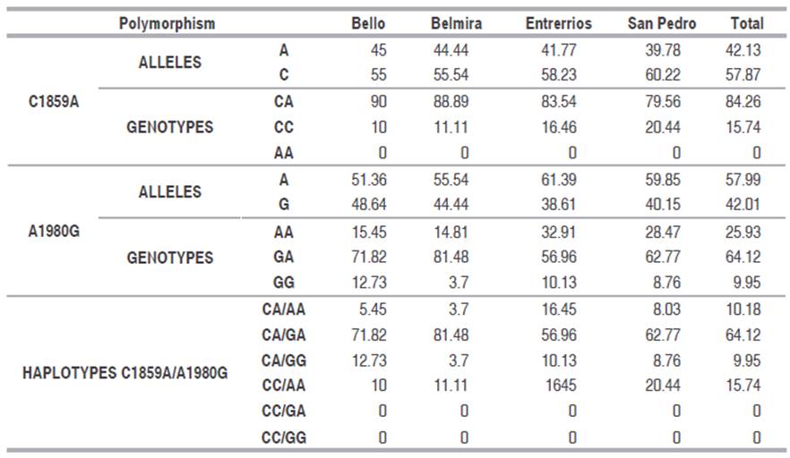 C1859A and A1980G polymorphisms of TLR6 gene of 432 animals from the municipalities of Bello, Belmira, Entrerríos and San Pedro de los Milagros were amplified. The first polymorphism generates no amino acid change and the second causes a change from isoleucine to valine, which, although is also an apolar and hydrophobic amino acid, has lower molecular weight. The three genotypes of A1980G polymorphism were found, but for C1859A polymorphism only CA and CC genotypes were found in the analyzed population (Table 1). The most frequent alleles were C for C1859A polymorphism and A for A1980G polymorphism; the most frequent genotypes were heterozygous ones in both polymorphisms and, in the case of A1980G, GA is followed by AA genotype. C1859A/A1980G most common haplotype was the CA/GA, followed by CC/AA, CA/AA and CA/GG. By municipality CA/GA remains the most common haplotype, followed by CC/AA, except in Bello, where it is followed by CA/GG; in Belmira, CA/AA and CA/GG haplotypes are equally represented, as are CC/AA and CA/AA haplotypes in Entrerríos. AA genotype of A1980G polymorphism was the only one found with the two genotypes of C1859A polymorphism; the other two were always found with genotype CA of C1859A.