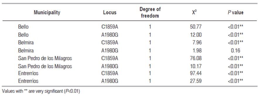 In Table 2 are shown the X2 and P values of Hardy - Weinberg equilibrium state analysis. All polymorphisms in all municipalities are in disequilibrium state, except A1980G polymorphism in Belmira. As said above, the artificial selection processes the Holstein cattle suffer may be causing the frequencies of some alleles of TLR6 polymorphisms are reducing.
