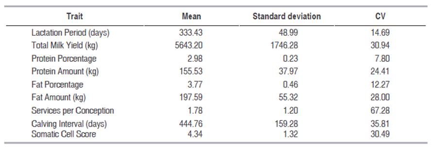 In Table 3, the mean and CV of the analyzed traits are shown.
