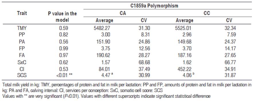 The analysis of allelic substitution to establish the trait changes with each change of allele only yielded significant effect on the SCS (Table 7). For C1859A polymorphism changing each C for A is unfavorable for TMY, SXC, CI and SCS, while changing each A for G in A1980G polymorphism is unfavorable for PP, PA and SCS. The change from CC to AA in the C1859A polymorphism can generate an increase up to 0.74 and the change from AA to GG in A1980G polymorphism can generate an increase up to 0.22 in SCS.
