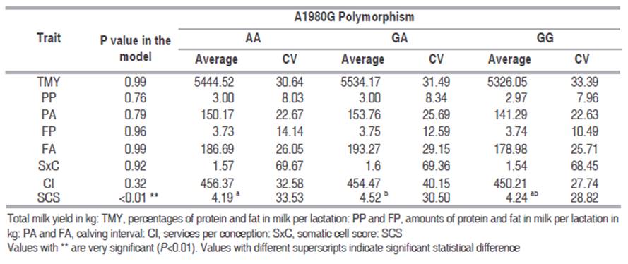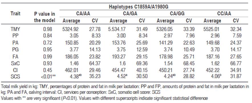 The association analysis showed that none of the polymorphisms had a significant effect on the evaluated trait, except for SCS, in which the effects were significant (P<0.01), including the effect of the haplotype (Tables 4 and 5). Since from C1859A polymorphism only CA and CC genotypes were found, were these genotypes the ones that had significant differences (P=0.0042); in the case of A1980G polymorphism, which both homozygous genotypes were found, there was a significant difference between GA and AA genotypes (P=0.0143). The difference of SCS between C1859A/A1980G haplotypes, with P=0.0087, was among CA/GA and CC/AA (Table 6). Both statistical association and the comparison of averages between genotypes and haplotypes indicate a favorable effect of C allele of C1859A and A allele of A1980G on the SCS feature.