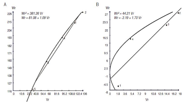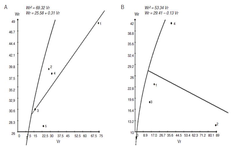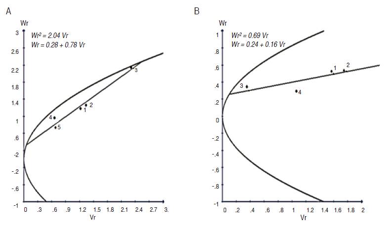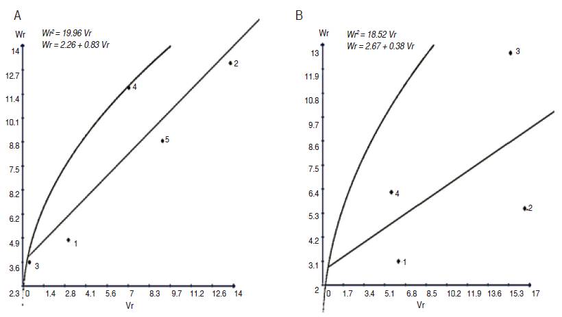 Figure 8: Regression of Wr on Vr graphs for BIO in G1 (A) and G2 (B) parental groups.