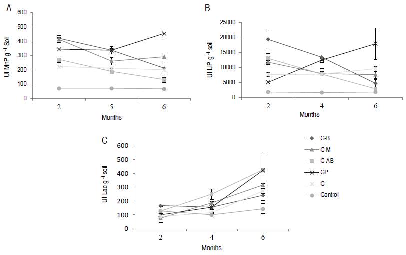 In Figure 2, an early increase is evident in the activity of lignin peroxidase (LiP) and manganese peroxidase (MnP) enzymes in saline-sodic soil after two months of treatment with LRC and CSB. This is possibly due to the LRC properties, characterized by the presence of element that favor the microbial nutrition and development of CSB (Cubillos-Hinojosa et al., 2015). However, LiP and MnP activity cannot be attributed to the effect of the application of CSB, because peroxidase enzyme activities are not known (LiP and MnP) in bacteria. Therefore, this ligninolytic activity may be being performed by fungi found in the microhabitat formed in the porous spaces of the LRC or by native fungi inthe saline-sodic soil. These microorganisms may be being induced to generate LiP and MnP extracellular enzymes that biotransform LRC as described by Fakoussa and Hofrichter (1999).