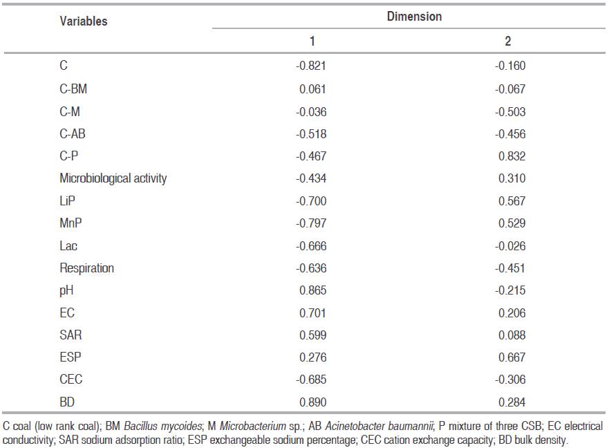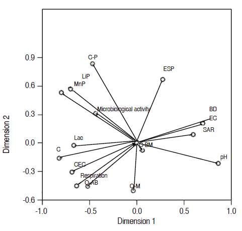 Figure 3 shows the categorical principal components analysis (CATPCA) that was performed to establish the association between the evaluated variables in the sixth month post-treatment of saline-sodic soil with LRC and CSB. The CATPCA explained 57% of the variability of the data in two dimensions: 39% in dimension 1 and 18% in dimension 2 (Table 5). The most influential variables in dimension 1 were LRC, activity of the enzymes LiP, MNP and Lac, soil respiration, pH, EC, CEC and BD of soil, while in dimension 2 it was the Pool of the three CSB and ESP (Table 6).