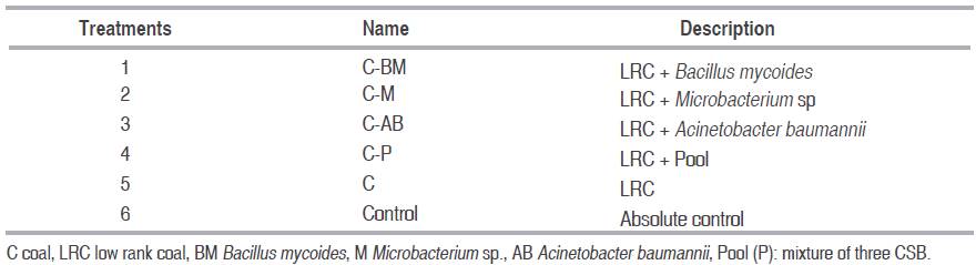 In this experiment, the same coal solubilizing bacteria (CSB) evaluated in the greenhouse study by Cubillos-Hinojosa et al. (2015) were used. These bacteria (Bacillus mycoides, Acinetobacter baumannii and Microbacterium sp.) had been isolated in a previous study by Valero et al. (2012), from the rhizosphere of plants present in the area of accumulation of coal sediments, sediments from the washing of coal and LRC respectively. The CSB were reported by Valero et al., (2011) for the ability to solubilize LRC in solid medium and liquid releasing humified organic matter (HOM).