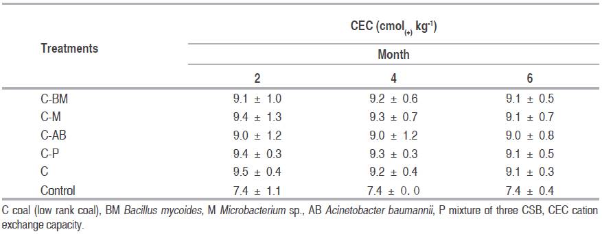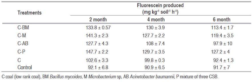 The activation of ligninolytic enzymes allow fungi to depolymerize the components of the mobile phase of coal, which it is a material of plant origin with a structure very similar to lignin, containing organic matter such as carbon and energy for their metabolism. Also in the process of coal biotransformation some elements important for microbial nutrition such as nitrogen, sulfur and iron can be available. All these phenomena could have been favoring the colonization and growth of inoculated CSB, the native microorganisms of the LRC, and native microorganism of saline-sodic soil, contributing to increase of microbiological activity as described above.