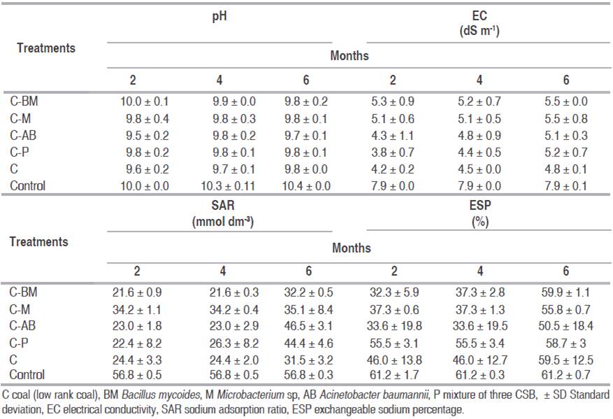 During the 6 months of the experiment, no significant changes in the pH (P<0.05) were generated according to Dunnett's comparison test (Table 3). After two months post-treatment of saline-sodic soil with the LRC and CSB, the EC of soil decreased in all treatments, showing significant differences (P<0.05) in some treatments (C-P, C, C-AB, C-M and C-BM) with respect to the control. In the fourth month, the results showed that only the C-P, C, and C-AB treatments maintained significant differences with respect to the control, and in the sixth month a greater decrease in soil EC was found when treated only with LRC compared to the control by significant differences (P<0.05). Therefore, the addition of LRC alone or in conjunction with the CSB inoculum have an effect on the EC of saline-sodic soil, and agrees with that found by Vance et al. (1998), that when applying organic matter with gypsum on the surface of a Natrixeralf soil managed to decrease the EC compared to an untreated control soil.