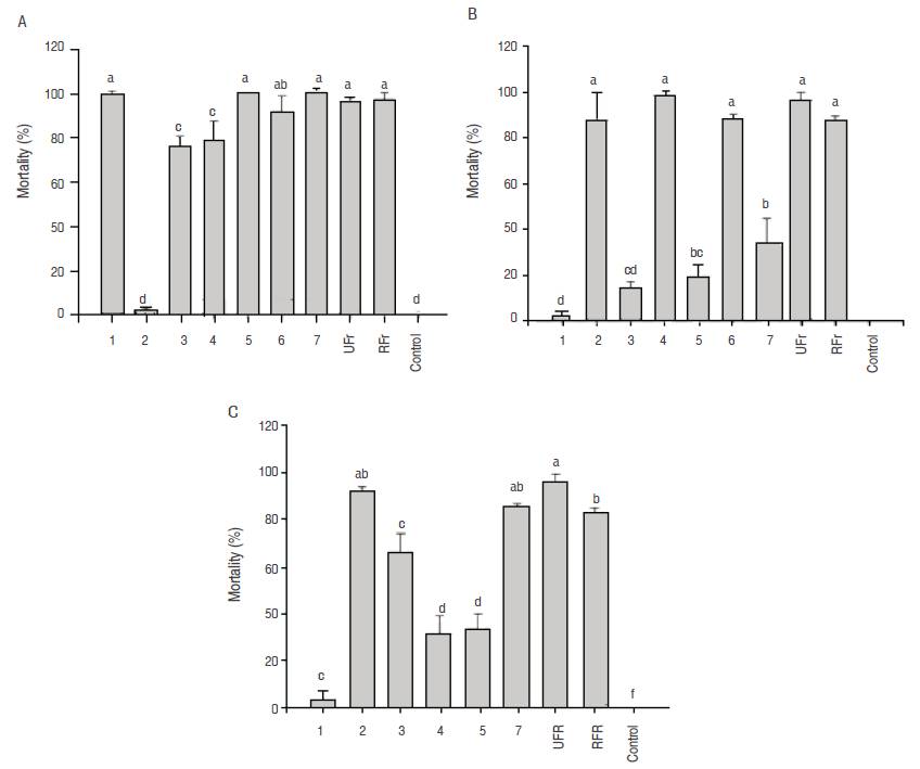 Figure 2: A. Mean toxicity caused by the oil and constituents of S. terebinthifolius ripened (RFr) and unripened (UFr) fruits to R. dominica. B. Mean toxicity caused by the RFr oil, Full Artificial Mixture (FAM) and selected blends of constituents. C. Mean toxicity caused by the UFr oil, FAM and selected blends. Concentrations were applied at levels equivalent to the fruit oils that showed mortality ≥ 95% (72h).
